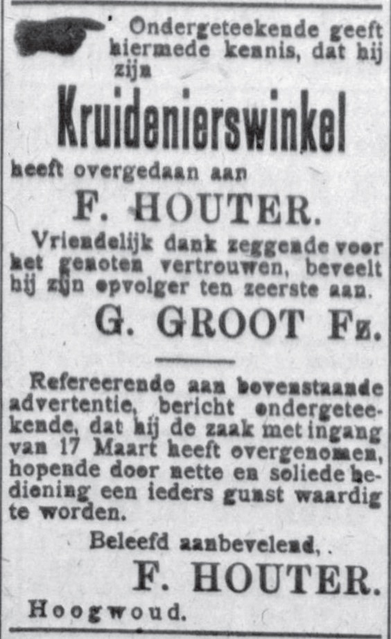 Auto’s, motoren, fietsen, stro, vlees, vis, sigaren, port, huishoudelijke artikelen, allerlei tweedehands spullen, pianolessen. Een kruidenier doet zijn zaak over, een visboer verkoopt draadnagels. Er was van alles in de aanbieding in de gemeente zo kort na de Eerste Wereldoorlog. De middenstanders adverteerden in streekbladen. Onderstaande advertenties zijn een selectie uit De Nieuwe Courant (DNC, Hoorn 1894 – 1939) en De Schager Courant (SC, bestaat nog).