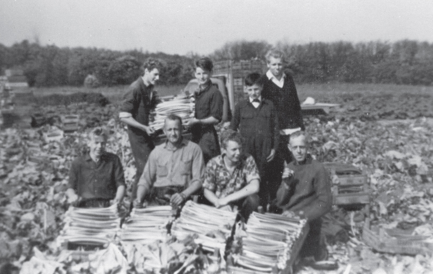 ‘De school was een jongensschool, in het oude gedeelte van Heemskerk, die we in januari 1959 verruilden voor de nieuwe Titus Brandsmaschool die we vanuit huis konden zien, hoe dichtbij kan je het hebben. Een plezierige tijd op de lagere school en daarna de ULO, een keus die je meekreeg naar gelang je werd ingedeeld in de zesde klas, HBS-kandidaten links, ULO in het midden en de rest rechts, met bijvoorbeeld de notoire zittenblijver Frans. Hoofdmeester Beers, die tegelijk met ons daar was komen wonen, gaf elke dag les. De ULO was het echter niet voor mij. Het kerstrapport liet ik aan vader Arie zien, die vroeg wat ik daar mee ging doen. Mijn antwoord was dat volgens mij, de ambachtsschool beter zou zijn. “Loikt moin ok m’n joôn”, zo dat was geregeld en ik liet mezelf inschrijven op de Sint Eloyschool in Beverwijk. Vader Arie liet zijn kinderen veelal zelf beslissingen nemen, hier en daar sturend, met weinig woorden. Hij wás een man van weinig woorden, druk bezig met zijn werk en nevenwerkzaamheden in de tuinderijen zowel in de Noord (Heemskerkers noemden West-Friesland de Noord) als wel in het duingebied van Heemskerk, altijd zorgen voor een goed inkomen voor zijn gezin.’ ‘Al op jonge leeftijd liet hij ons meewerken/meehelpen op de tuinderijen, zilveruien oogsten en later vooral de rabarber. Als elfjarige (al) werd ik ’s morgens vroeg geroepen door vader en dan gingen we erop af, hij op de Solex en ik op de fiets die we aan het begin van het duin verruilden, hoe feestelijk kan je het maken! Mijn (werk)vrienden werden ook in geschakeld, vooral de tweede paasdag was een speciale rabarber oogstdag. Al vroeg in de ochtend werden we gewekt, de stikkebuul was al klaargemaakt door moeder Mina en in de loop van de ochtend kwamen de anderen. Dan was het heel belangrijk om zoveel mogelijk rabarber voor de volgende dag op de markt in Amsterdam te leveren. Daar waren (na de twee Paasdagen) heel veel gretige kopers voor verse producten. Iedereen werd dan ook ingeschakeld om alles op tijd in de laadbak te krijgen van handelaar de Vries. De werkvrienden kwamen vooral uit de Noord wat een samenhorigheid gaf, heel plezierig en gezellig om met vader Arie te werken, samen te zijn. Met mijn broer Piet, zes jaar jonger, kunnen we daarover samen genoeglijk onze herinneringen ophalen.’