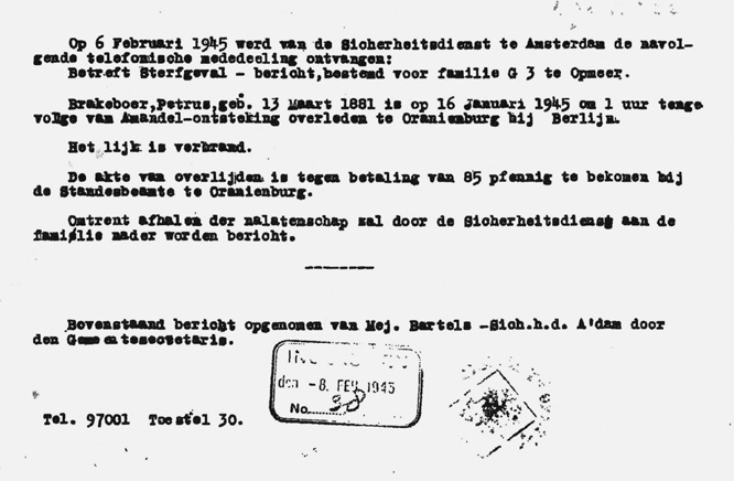 Op 6 februari 1945 was er telefonisch een bericht binnengekomen op het gemeentehuis in Opmeer. Daarin werd gemeld dat de heer Petrus Brakeboer op 16 januari 1945 was overleden aan een amandelontsteking (lees ontberingen) en dat zijn as was verstrooid op de gedenkplaats van kamp Sachsenhausen-Oranienburg in Duitsland. Tegen betaling van 85 pfennig was de acte van overlijden te bekomen bij de Standesbeamte van Oranienburg Duitsland.