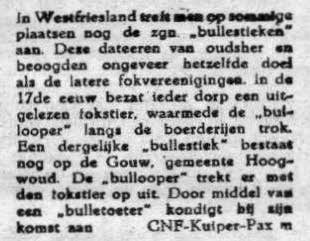 In de archieven van de gemeente Hoogwoud vinden we een instructie voor de bulloper Evert Maartenz voor de bullestiek Oost Uyt te Hoogwoud uit 1764.
