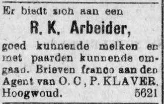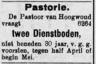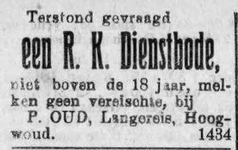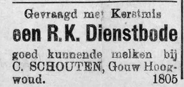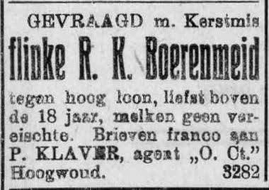 Advertenties uit Onze Courant, katholiek dagblad voor West-Friesland (1905-1931). Zijn de dienstbodes alleen nodig met Kerstmis of ook daarna? Moeten ze per se katholiek zijn of niet? Waarom moeten boerenmeiden en -knechten flink zijn en dienstbodes niet? In 1920 wisten de lezers kennelijk de antwoorden op deze vragen.