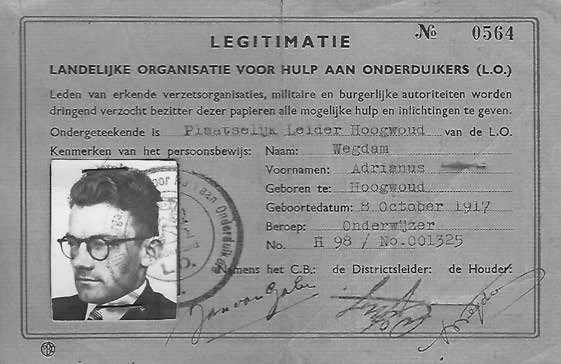 Adriaan Wegdam (geb. 8 oktober 1917) ging direct nadat hij in 1938 als onderwijzer was afgestudeerd, in militaire dienst. Na zijn demobilisatie, op 7 juni 1941, ging hij bij de distributiedienst werken. Daar was hij voor de leiding van de Nederlandse Unie, waarvan hij lid was, de aangewezen man om bonkaarten te bemachtigen. Niet lang daarna kreeg hij de zorg voor onderduikers. Wegdam onderhield namens Hoogwoud en de buurgemeenten Spanbroek, Obdam, Wognum, Medemblik en Westwoud het contact met de ‘top’ van de Nederlandse Unie in Alkmaar. Tegen het einde van de oorlog zat hij tot aan zijn nek toe in het illegale werk, dat toen levensgevaarlijk was geworden. Na de oorlog heeft Adriaan Wegdam geen contacten meer gehad met zijn kameraden uit het verzet. ‘lk ben altijd erg nuchter geweest. Ik heb direct ingezien dat je de contacten met het verzet niet aan moest houden. Dat je het verleden niet levend moest houden.’