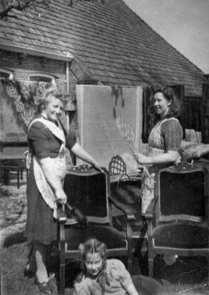 Ja, en dan de kamer en keuken uitsoppen (tenminste wanneer je een keuken rijk was, want op boerderijen kookten ze meestal op de koegang) en alle meubels met wrijfwas bewerken. De sluitgordijnen aan de lijn en de vitrage wassen, strijken en weer keurig ophangen, nadat de ramen natuurlijk waren gelapt. De stoelen gewreven, de lampenkappen van stof ontdaan en bezat je een lamp met porseleinen kapjes, dan werden die natuurlijk ook afgewassen en weer heel secuur op zijn plaats gedaan.