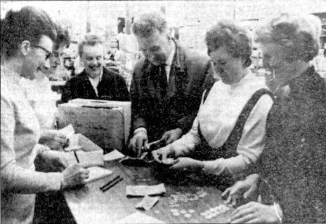 Bij Kaijer in de winkel worden de giften geteld door vlnr. Mien Kaijer, Tinie Kaijer,