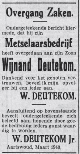 1940. Advertentie overname bedrijf door Wijnand.