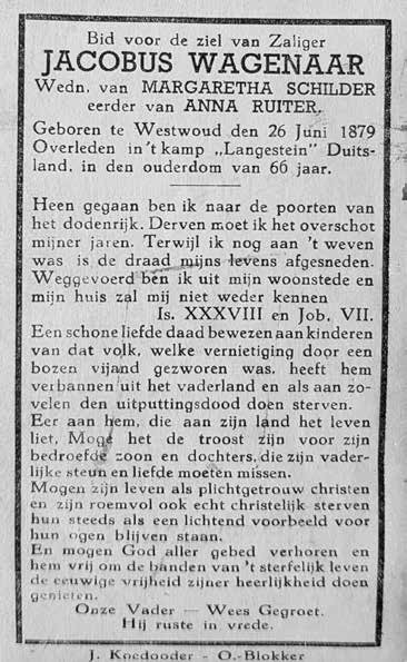 In zijn melkerskleren en op klompen is hij op de fiets vanuit Blokker meegenomen naar het Grote Oost in Hoorn. De heer Wagenaar moet hebben geweten dat hij voor het allerlaatst door het dorp fietste, bij het passeren van een kennis zei hij: ‘Dag Piet, mij zie je nooit meer terug.’ Ook de heer Wagenaar is in een Duits concentratiekamp omgekomen.