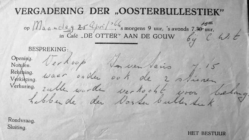 In januari 1924 werd het regelement van de Ooster bullestiek, zoals dat op 22 december1856 was opgesteld, door belanghebbenden, in vergadering bijeen in café ‘de Otter’, gewijzigd, goedgekeurd, opnieuw vastgesteld en ondertekend, te weten door de heren K. Slagter, Jb. Boon, G. Glas, K. Braak, G. Vijn, J. Hartog, D. Kooijman, P. Kuiper, P. Slijksteeg, H. Slotemaker, F. Smit, Joh. Appel en J. van der Molen.