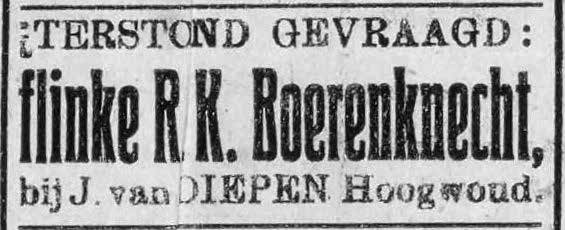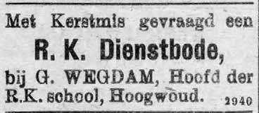 Advertenties uit Onze Courant, katholiek dagblad voor West-Friesland (1905-1931). Zijn de dienstbodes alleen nodig met Kerstmis of ook daarna? Moeten ze per se katholiek zijn of niet? Waarom moeten boerenmeiden en -knechten flink zijn en dienstbodes niet? In 1920 wisten de lezers kennelijk de antwoorden op deze vragen.