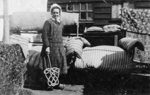 Dan kwamen de slaapkamers aan de beurt, de dekens over de waslijn, de matrassen of schudbedden buiten op stoelen en ze dan met de mattenklopper bewerken. Ook goed naar de lucht kijken natuurlijk of het niet onverwachts ging regenen. De dekens werden uitgeklopt maar dan moest je wel met twee personen zijn natuurlijk en vader was niet altijd bij huis aan het werk. Maar soms kon ook de bakker een handje helpen als hij langskwam met brood, of de kruidenier die kwam te rondvragen, of de slager die de bestelling voor de zaterdag op kwam nemen. Maar wat sliep je dan weer heerlijk in een schudbed dat dan wel van dons leek.