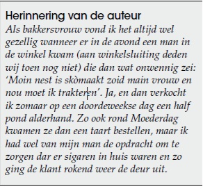 Ja, en dan de kamer en keuken uitsoppen (tenminste wanneer je een keuken rijk was, want op boerderijen kookten ze meestal op de koegang) en alle meubels met wrijfwas bewerken. De sluitgordijnen aan de lijn en de vitrage wassen, strijken en weer keurig ophangen, nadat de ramen natuurlijk waren gelapt. De stoelen gewreven, de lampenkappen van stof ontdaan en bezat je een lamp met porseleinen kapjes, dan werden die natuurlijk ook afgewassen en weer heel secuur op zijn plaats gedaan.